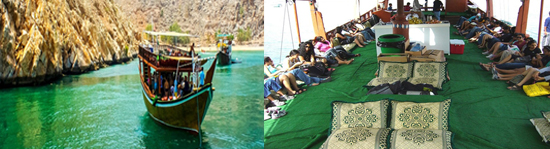 The trip to Musandam starts early in the morning by driving to Dibba, from there you will start your cruise in a Traditional Omani Dhow. Every Dhow is fully equipped with modern modes of communication. During the cruise we will anchor at various places, where you can swim & snorkel in the clear waters. There is also a great possibility to see the Dolphins at play.